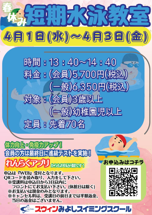 大好評を頂いている春休み短期水泳教室の開催が決まりました!!〈最終日に進級テストを実施〉〈一般の方も大歓迎〉〈お友達と一緒に〉